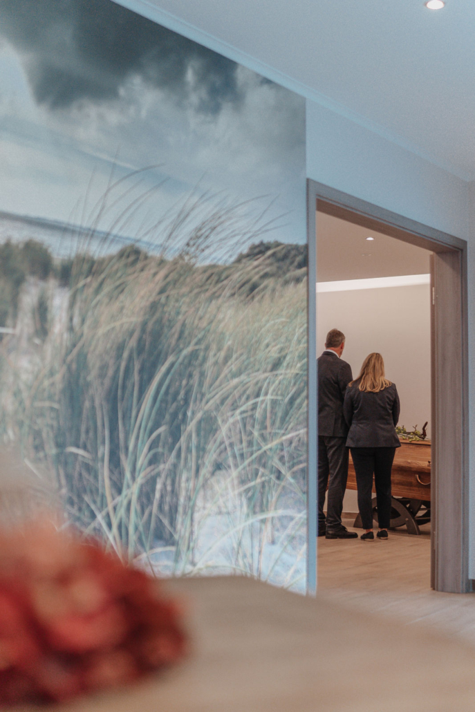 In unserem Abschiedsraum können wir auf Wunsch auch Trauerfeiern in einem feierlichen Rahmen ausrichten. Mit einem besonderen Beleuchtungskonzept und der Möglichkeit zur musikalischen Untermalung sowie der Projizierung von Bildern an die Wand kann die Trauerfeier wahlweise mit einem unserer Pastoren oder mit einem freien Redner durchgeführt werden. Um die individuelle Dekoration mit dem Blumenschmuck Ihrer Wahl kümmern wir uns gerne.
